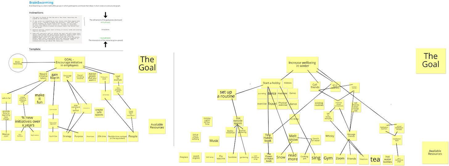 La réflexion peut alors commencer. Les participants devront indiquer sur un post-it chaque ressource disponible ainsi que chaque aspect de l’objectif à atteindre (ou “sous-objectif”). Au fur et à mesure des ajouts, vont se dessiner des correspondances entre les ressources disponibles et les “sous-objectifs”. Vous avez vos solutions !