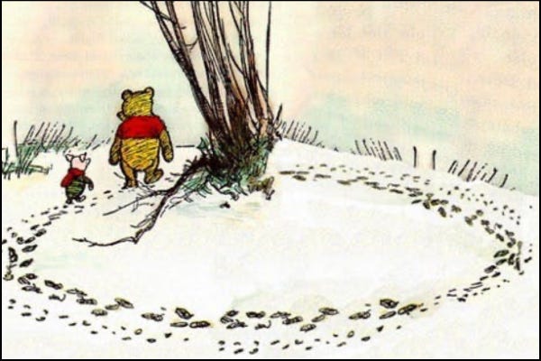 3. Le terme "effet Woozle" trouve son origine dans les aventures de Winnie l'ourson d'Alan Alexander Milne (1926). Dans l'histoire, Winnie et Porcinet suivent des traces dans la neige, pensant qu'elles appartiennent Ă un animal imaginaire appelĂ© "Woozle", alors qu'en rĂ©alitĂ©, ils suivent leurs propres traces, de plus en plus nombreuses, puisquâils tournent en rond⊠Le fait mĂȘme que les empreintes se multiplient, les confortent dans leur conviction.Â